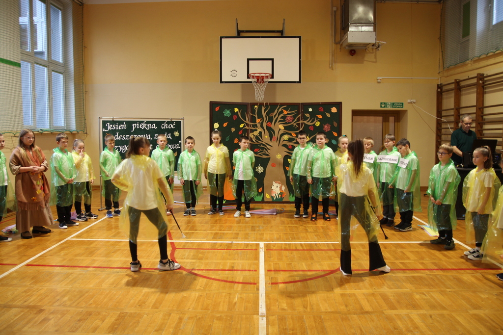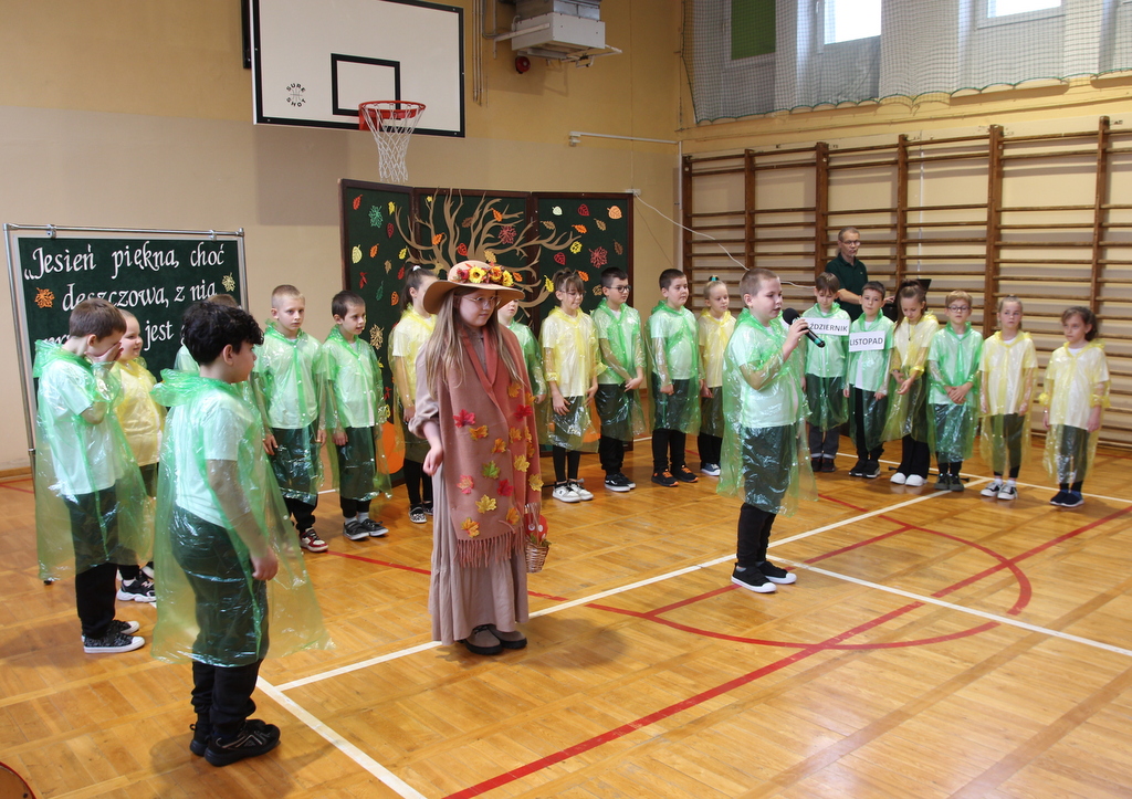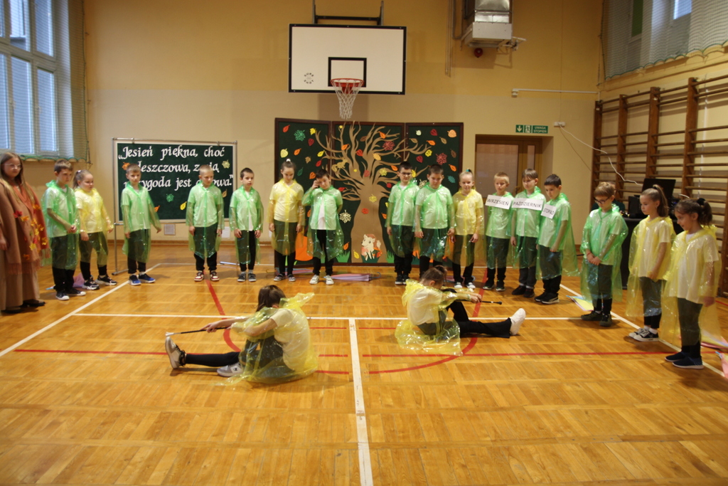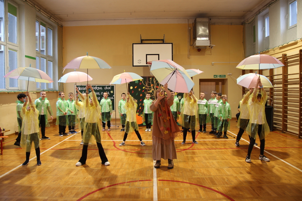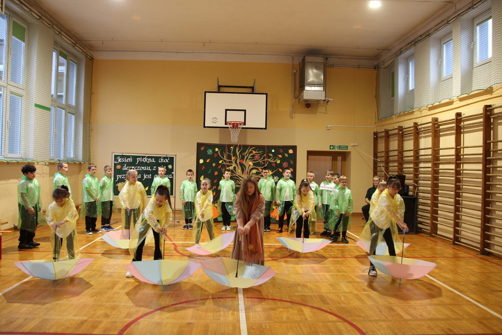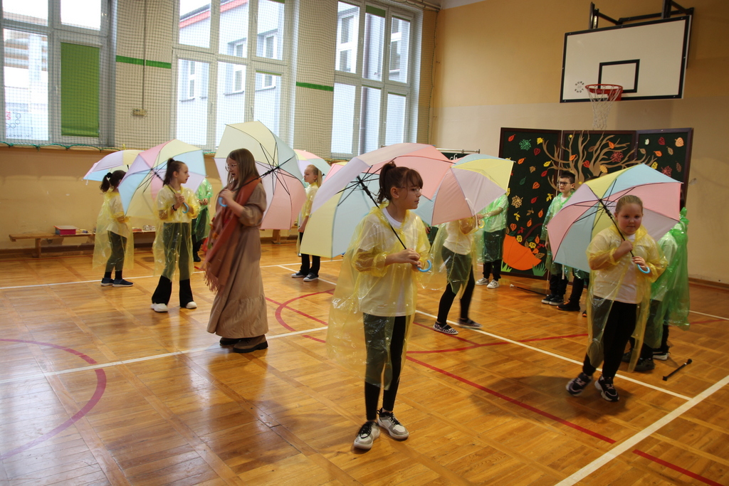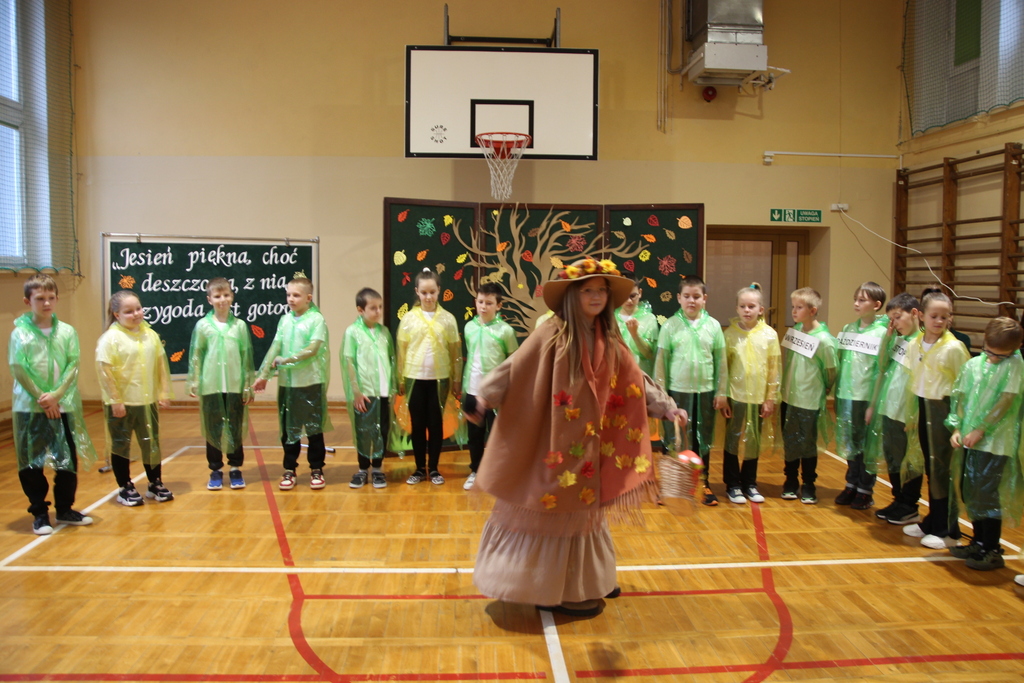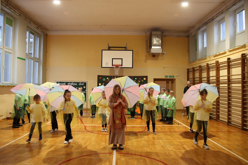 Uczniowie zaprezentowali wiersze o pięknej, złotej jesieni. Główną rolę odgrywała Pani Jesień, która powitała wszystkich ciepłym uśmiechem i opowiadała o swoich darach. Całość uświetniły radosne piosenki, które wprowadziły w jesienny nastrój. Dziewczynki wykonały piękny taniec z parasolami, a na koniec uczennice zatańczyły układ mażoretek z batonami przy jesiennej piosence.