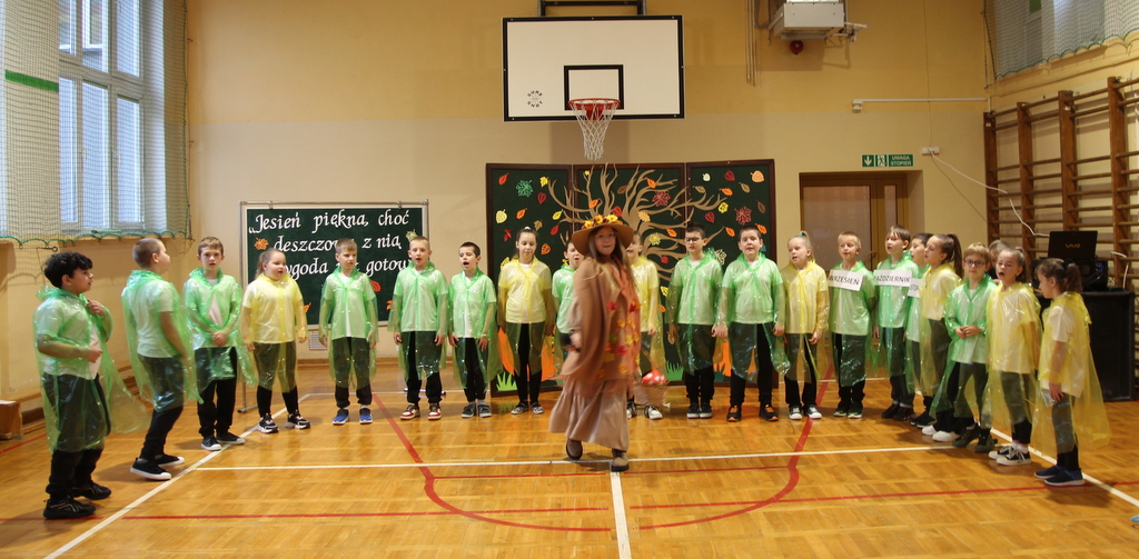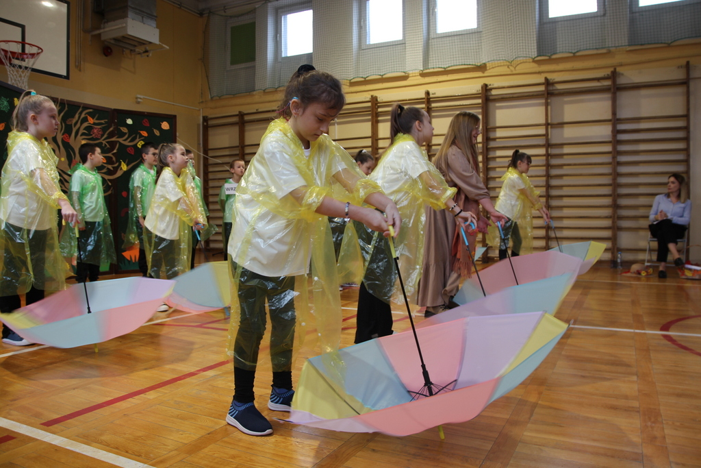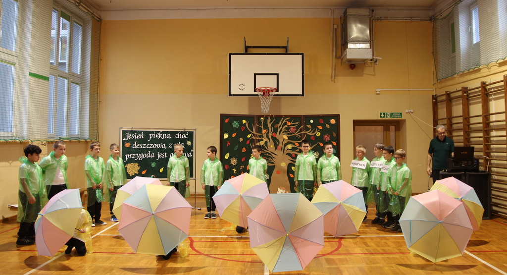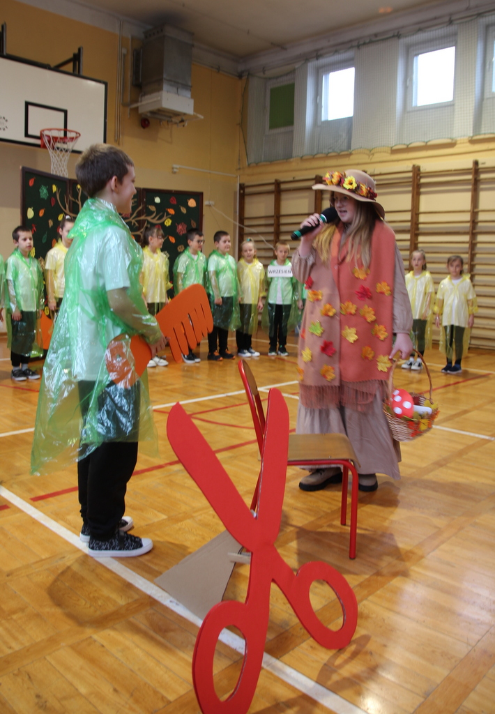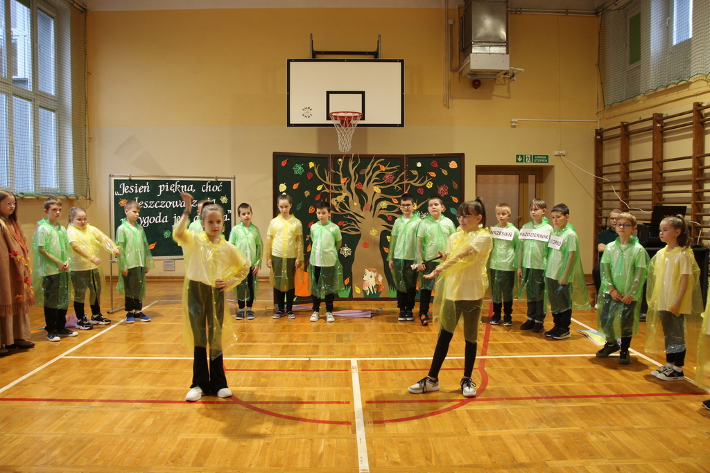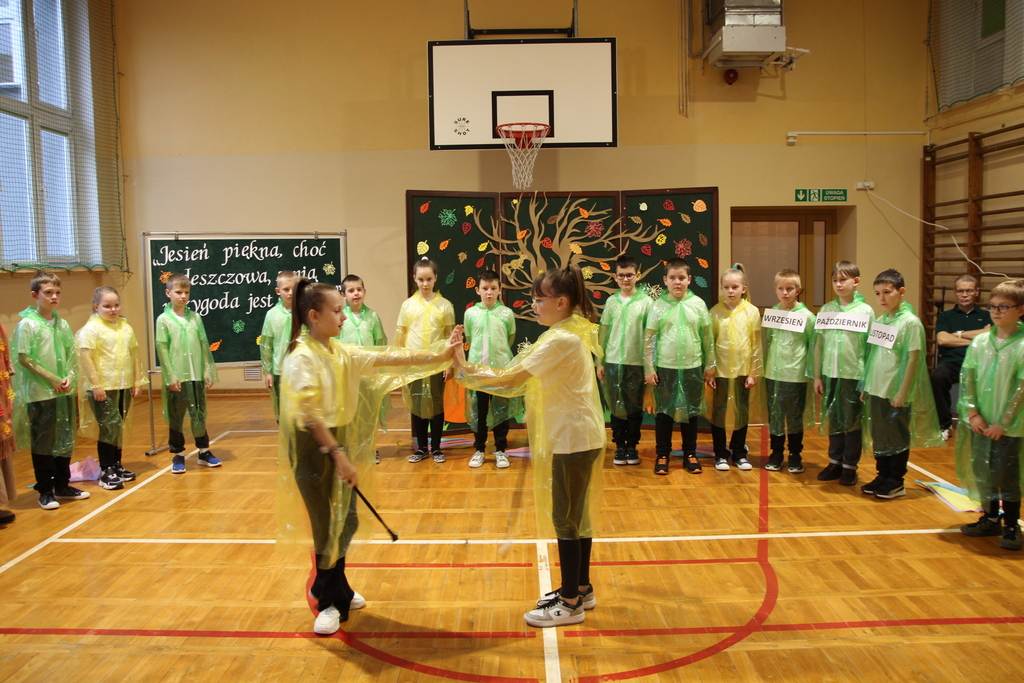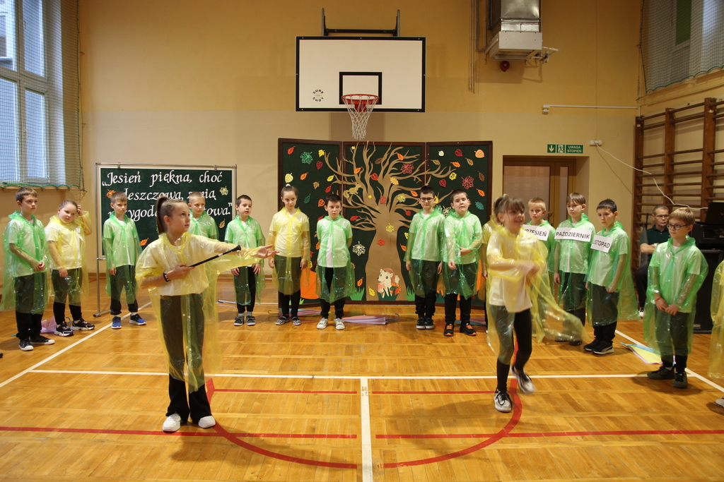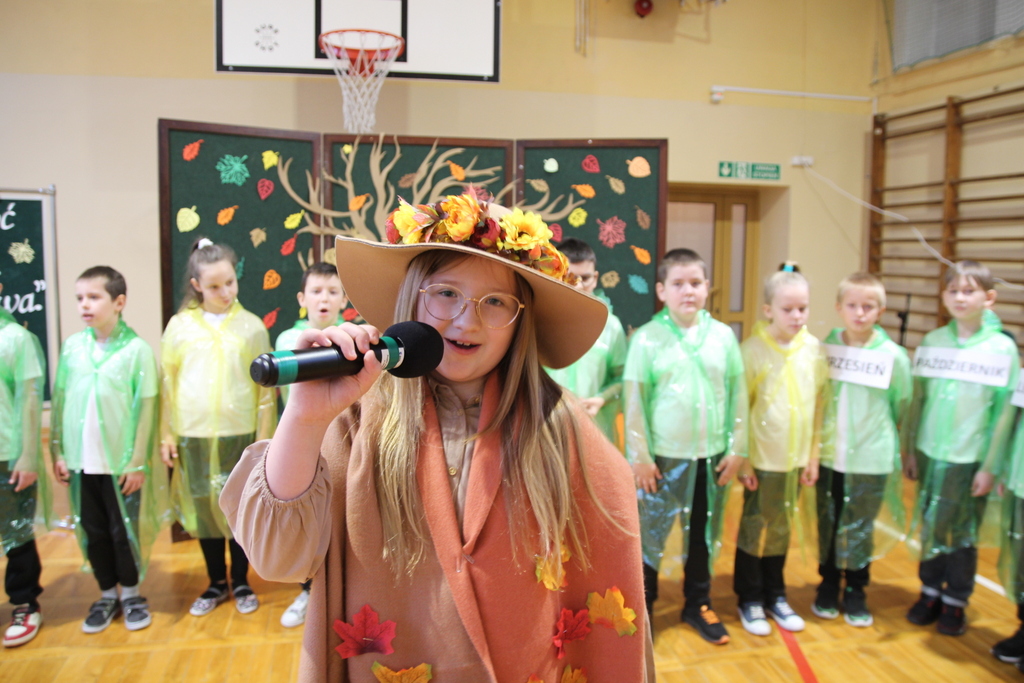 Uczniowie zaprezentowali wiersze o pięknej, złotej jesieni. Główną rolę odgrywała Pani Jesień, która powitała wszystkich ciepłym uśmiechem i opowiadała o swoich darach. Całość uświetniły radosne piosenki, które wprowadziły w jesienny nastrój. Dziewczynki wykonały piękny taniec z parasolami, a na koniec uczennice zatańczyły układ mażoretek z batonami przy jesiennej piosence.
