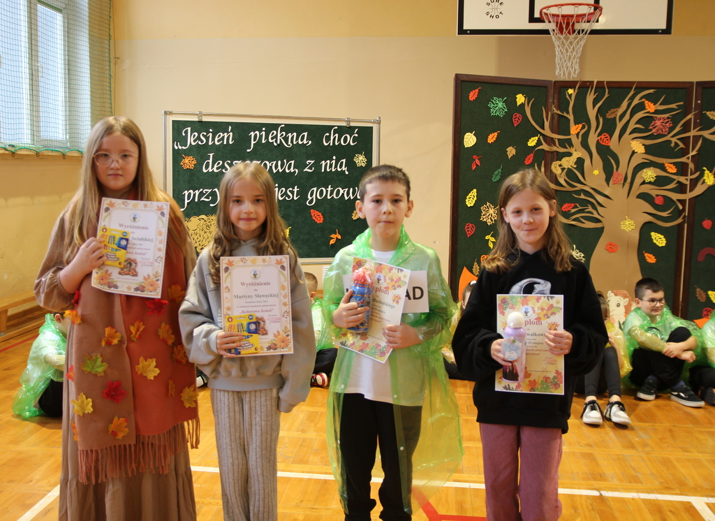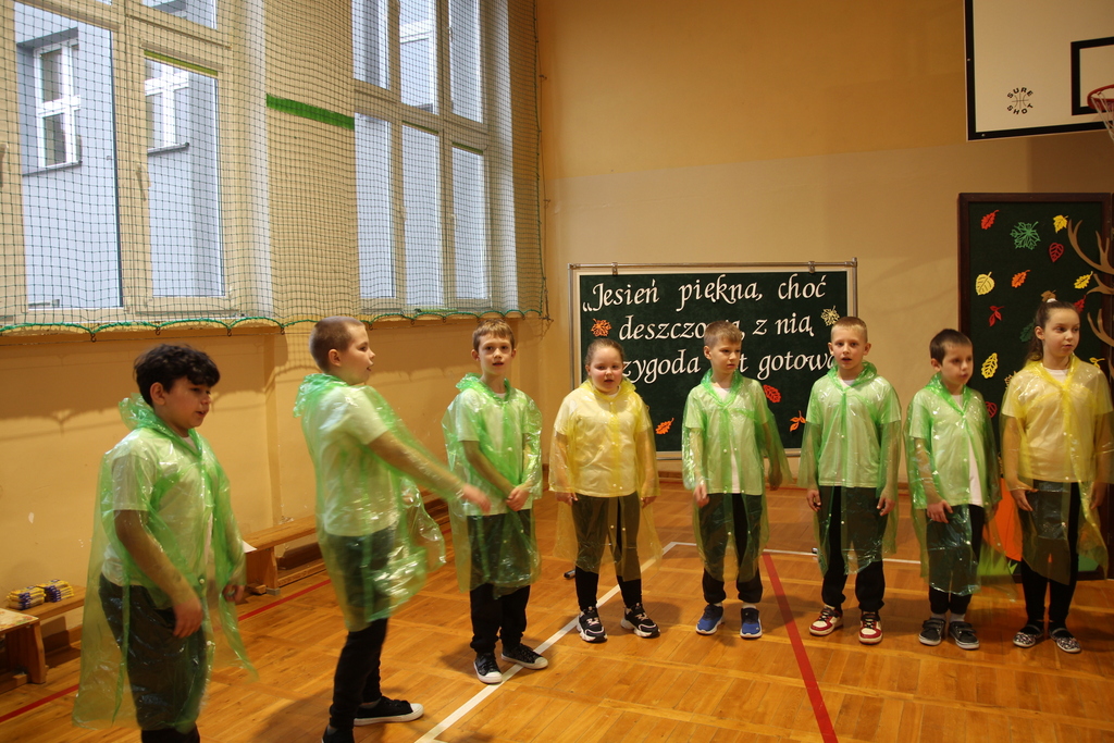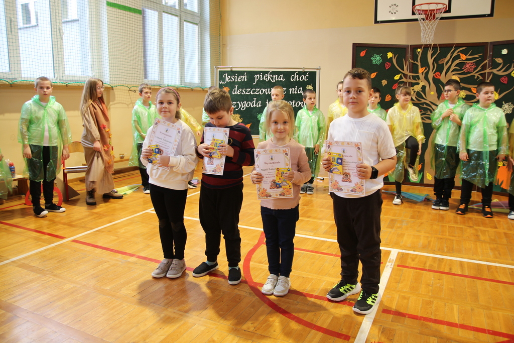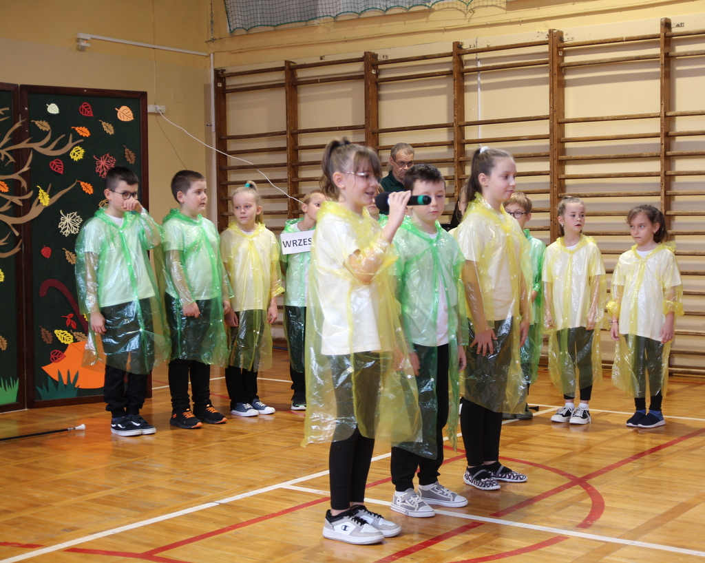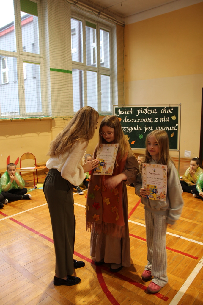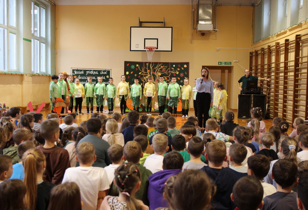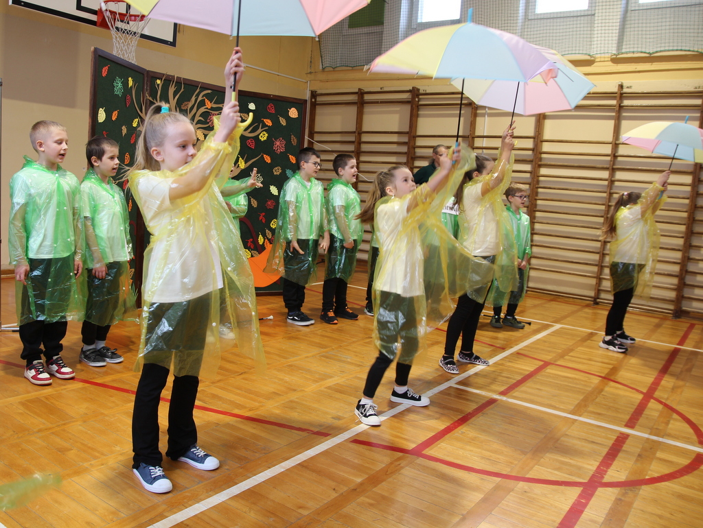 Uczniowie zaprezentowali wiersze o pięknej, złotej jesieni. Główną rolę odgrywała Pani Jesień, która powitała wszystkich ciepłym uśmiechem i opowiadała o swoich darach. Całość uświetniły radosne piosenki, które wprowadziły w jesienny nastrój. Dziewczynki wykonały piękny taniec z parasolami, a na koniec uczennice zatańczyły układ mażoretek z batonami przy jesiennej piosence.
