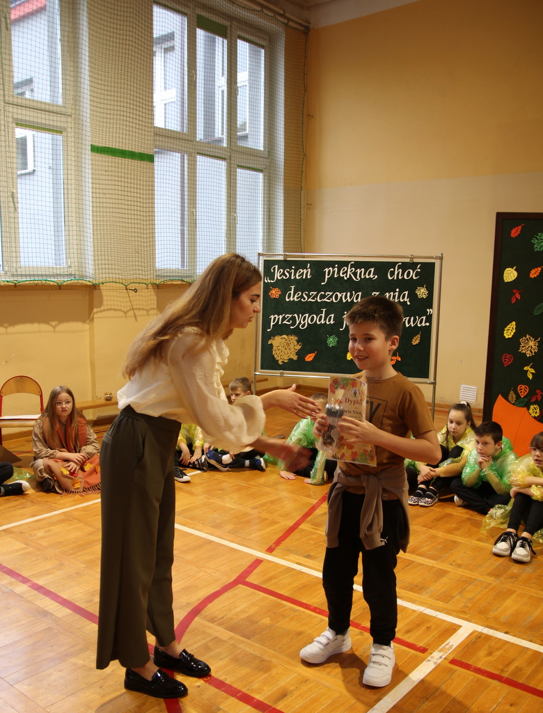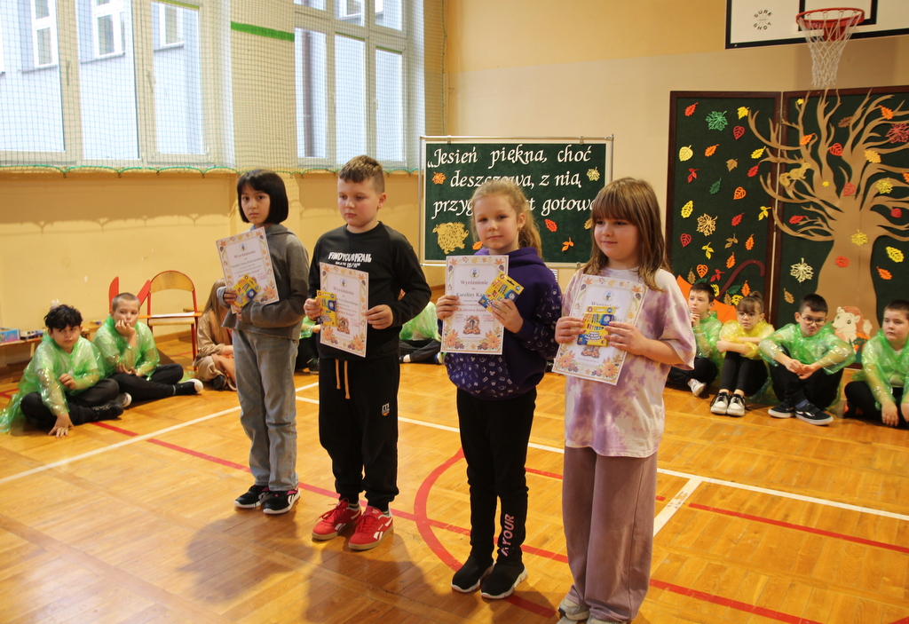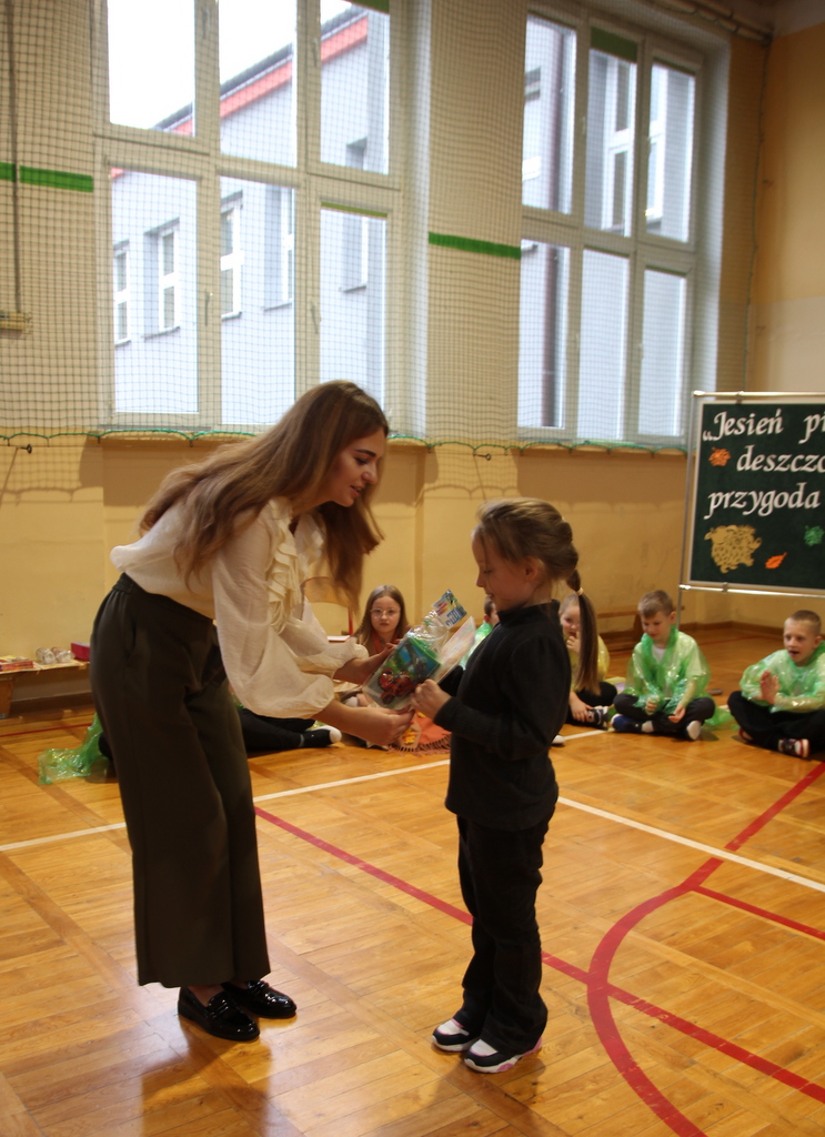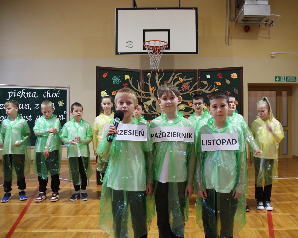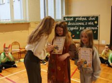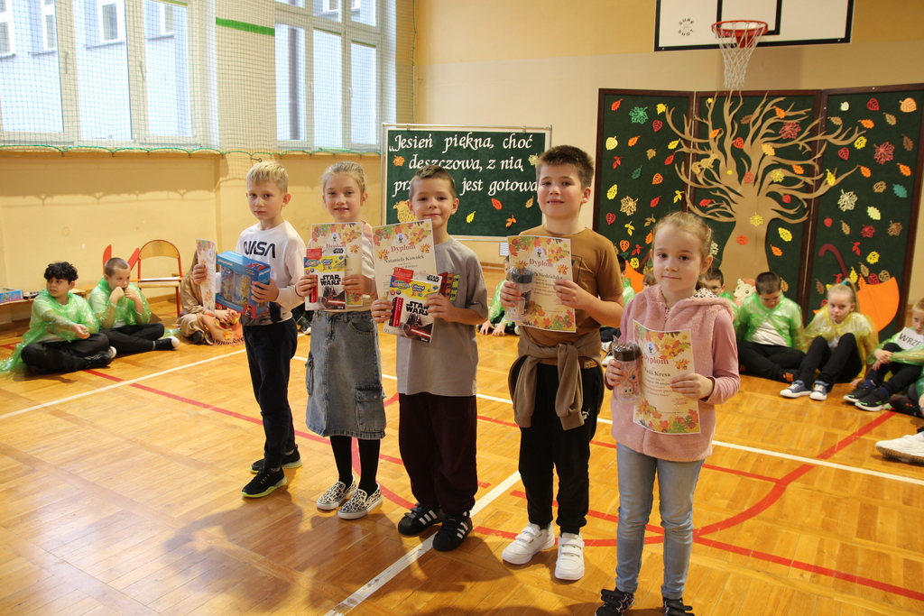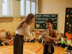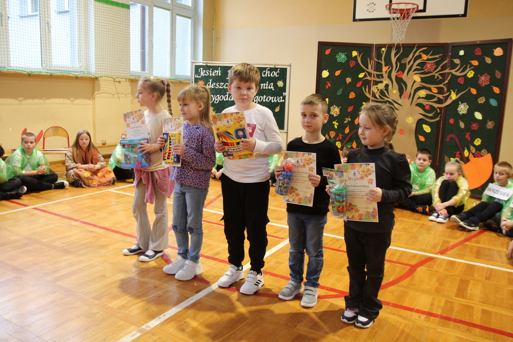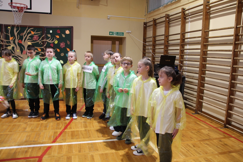 Uczniowie zaprezentowali wiersze o pięknej, złotej jesieni. Główną rolę odgrywała Pani Jesień, która powitała wszystkich ciepłym uśmiechem i opowiadała o swoich darach. Całość uświetniły radosne piosenki, które wprowadziły w jesienny nastrój. Dziewczynki wykonały piękny taniec z parasolami, a na koniec uczennice zatańczyły układ mażoretek z batonami przy jesiennej piosence.