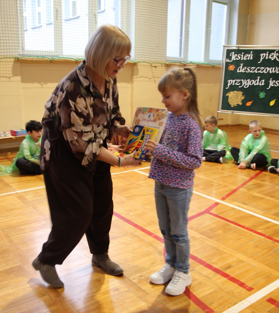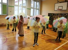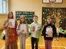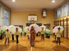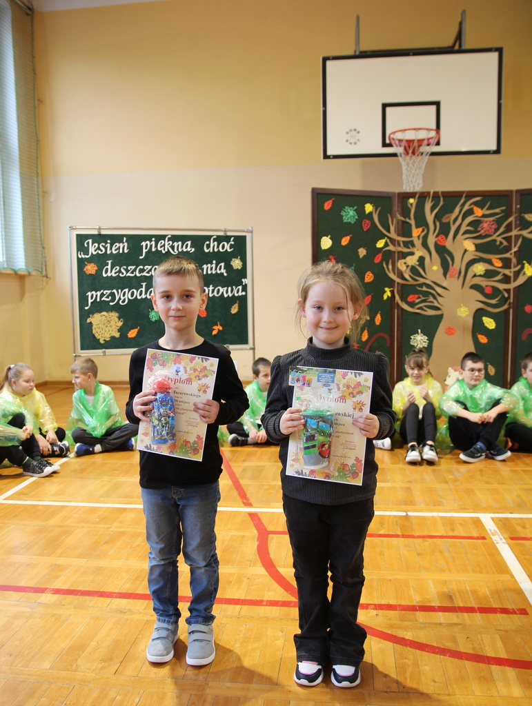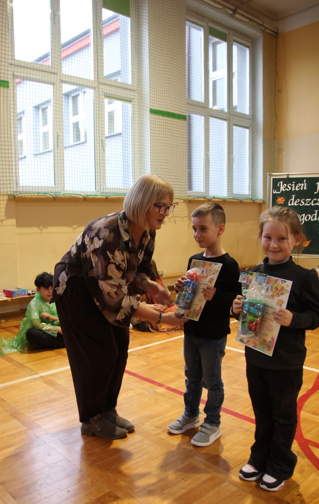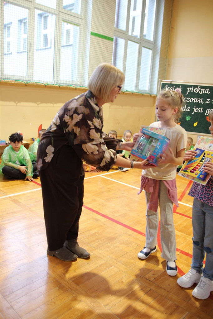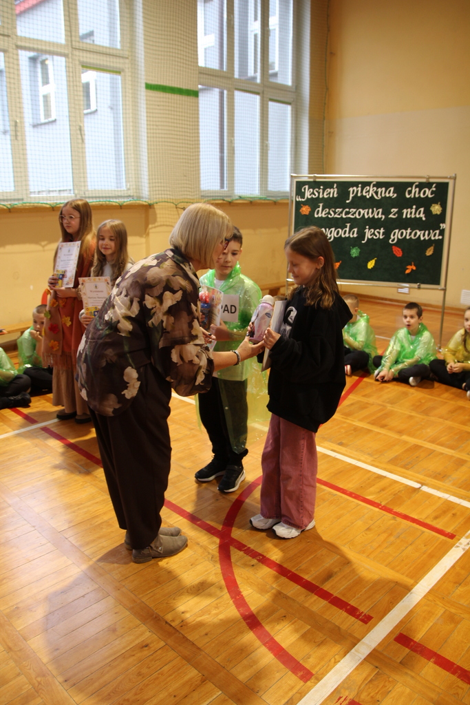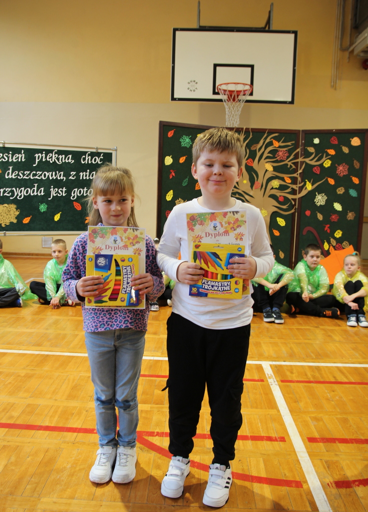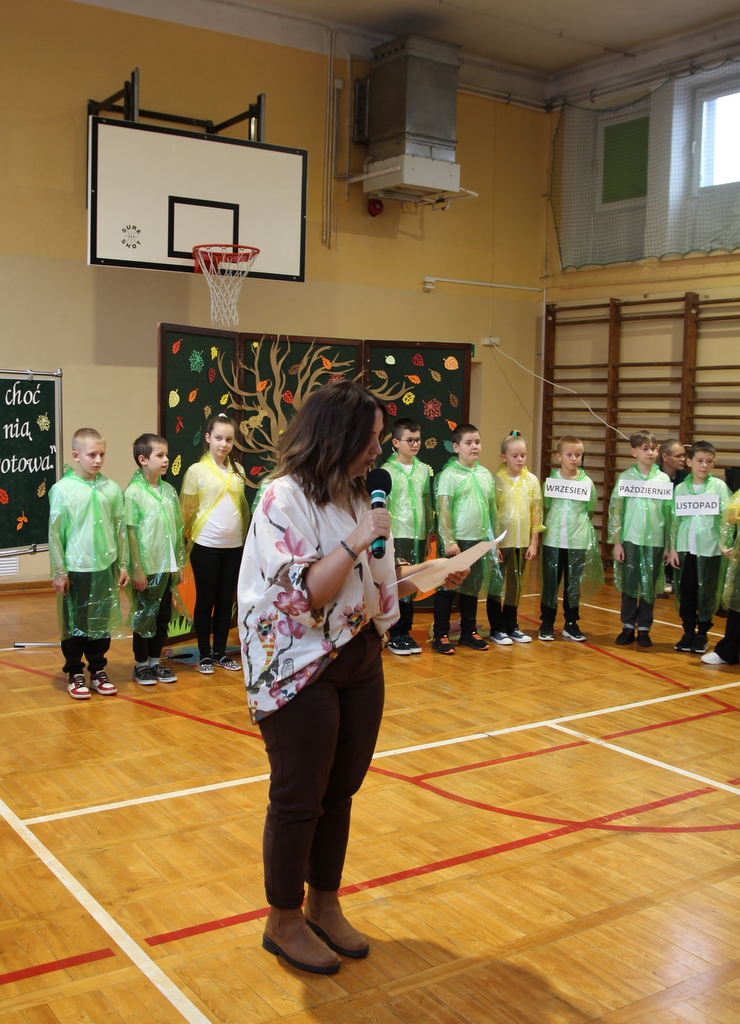 Uczniowie zaprezentowali wiersze o pięknej, złotej jesieni. Główną rolę odgrywała Pani Jesień, która powitała wszystkich ciepłym uśmiechem i opowiadała o swoich darach. Całość uświetniły radosne piosenki, które wprowadziły w jesienny nastrój. Dziewczynki wykonały piękny taniec z parasolami, a na koniec uczennice zatańczyły układ mażoretek z batonami przy jesiennej piosence.