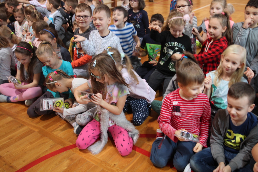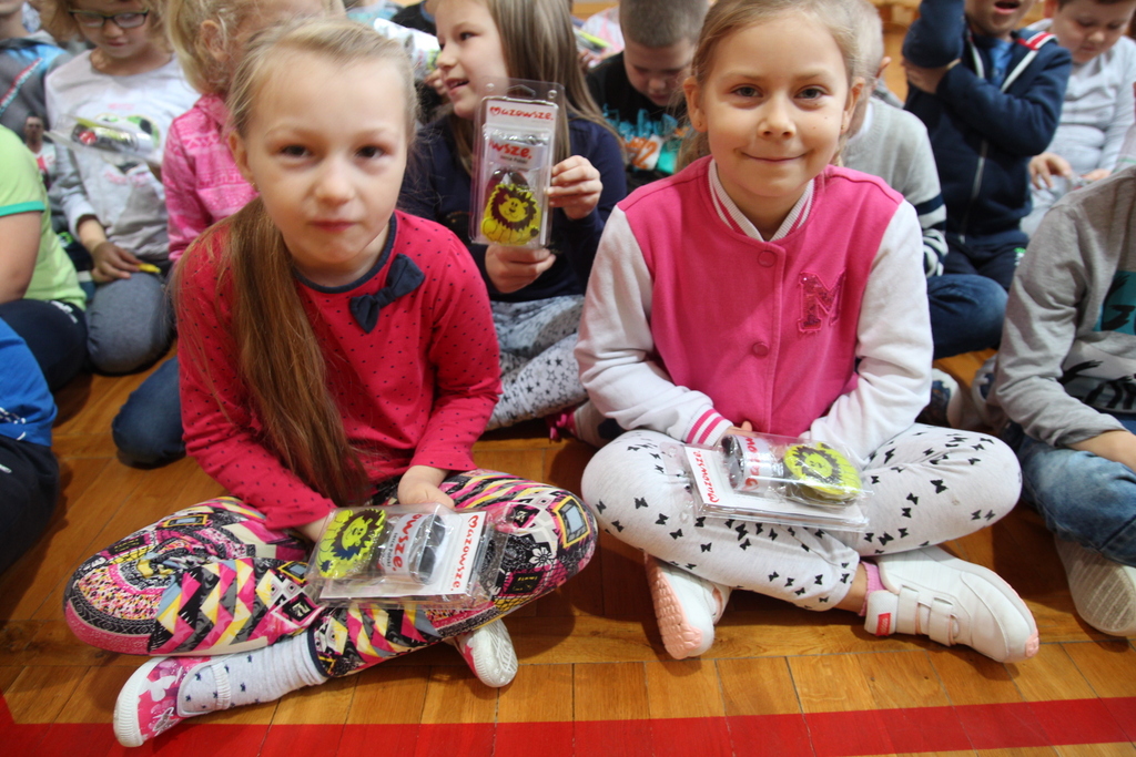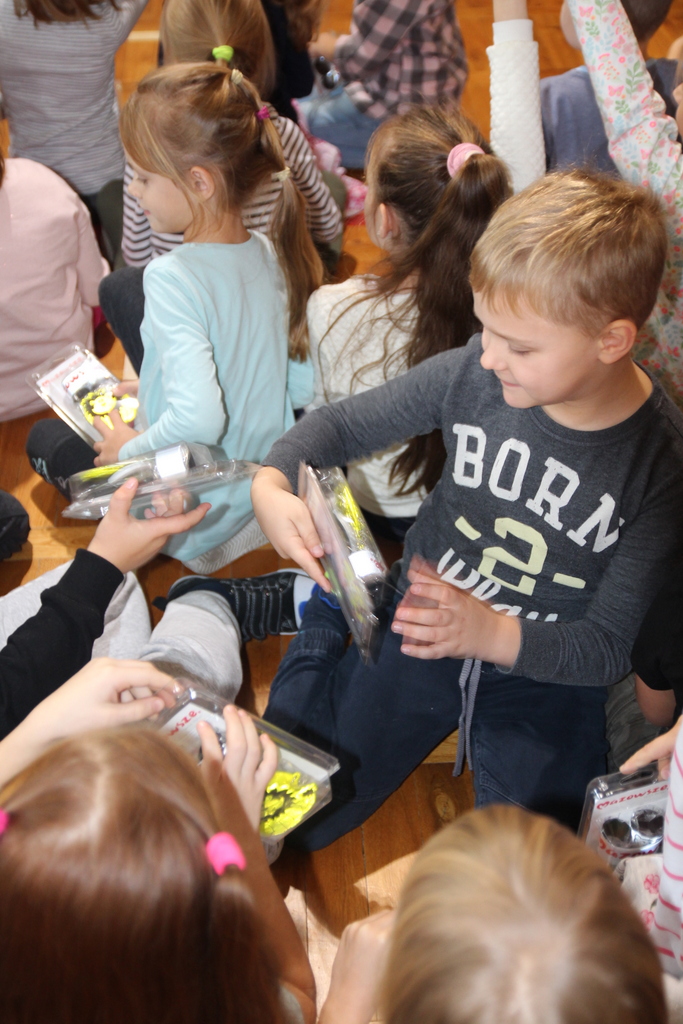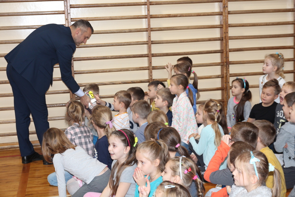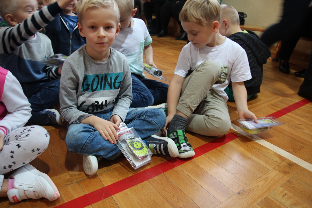 Podczas spotkania pierwszoklasiści otrzymali odblaskowe elementy ubioru