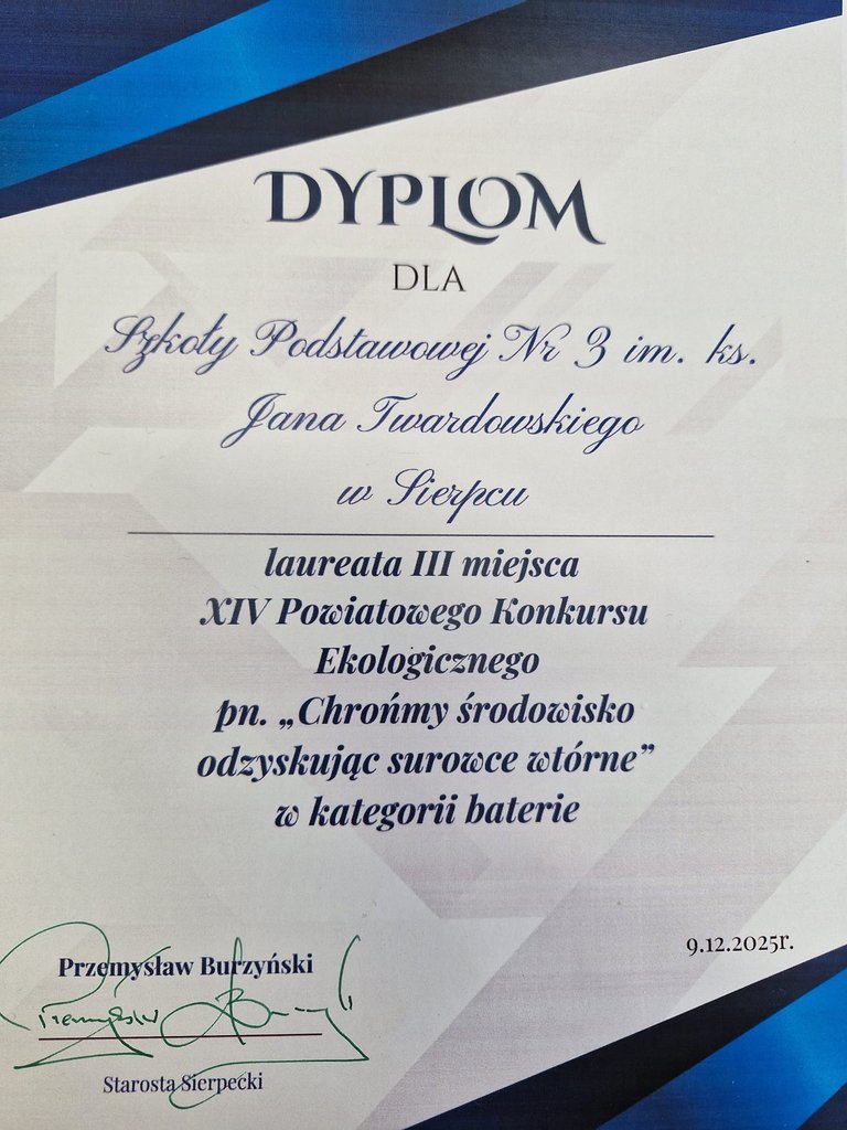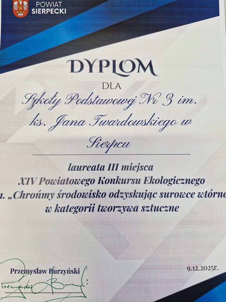 9 grudnia 2025r. w siedzibie Starostwa Powiatowego w Sierpcu odbyło się podsumowanie XIV edycji Powiatowego Konkursu Ekologicznego „Chrońmy środowisko, odzyskując surowce wtórne”.
