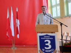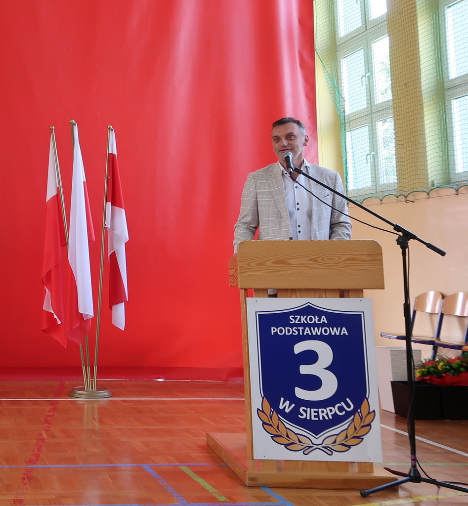Z radością przywitaliśmy również Burmistrza Miasta Sierpca, Pana Jarosława Perzyńskiego, który swoją obecnością uświetnił naszą uroczystość. W swoim przemówieniu Pan Burmistrz podkreślił znaczenie edukacji i wyraził dumę z uczniów, którzy godnie reprezentują nasze miasto. Złożył też gratulacje nagrodzonym oraz podziękowania nauczycielom za ich nieocenioną pracę.